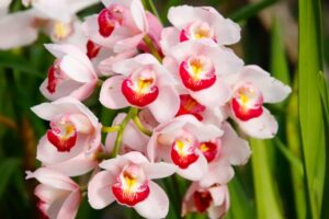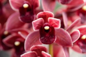 シンビジウムの花は花は大きく、通常1本の茎に10~20個の花を付け鮮やかな色彩や模様が特徴で、花弁が広がることで非常に華やかに見えます。花の色は白、ピンク、赤、黄色、緑、オレンジなどさまざまであり花の模様や色合いは品種によって大きく異なります。また、花の形はランの特徴である独特な形状をしており観賞価値が高いです。