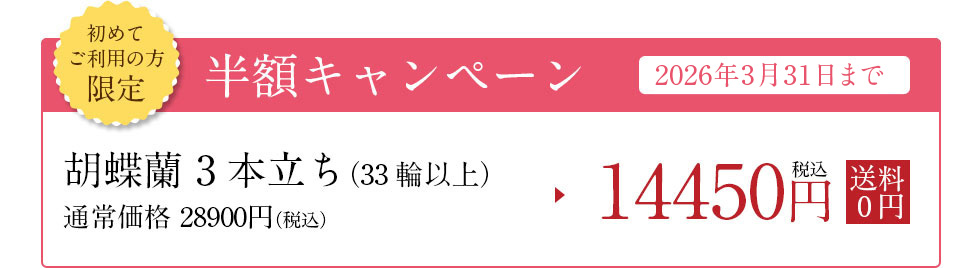 冬季期間中、お届け地域によっては、胡蝶蘭の開花が7~8分咲きでのお届けとなる場合がございます。何卒、ご了承くださいませ。